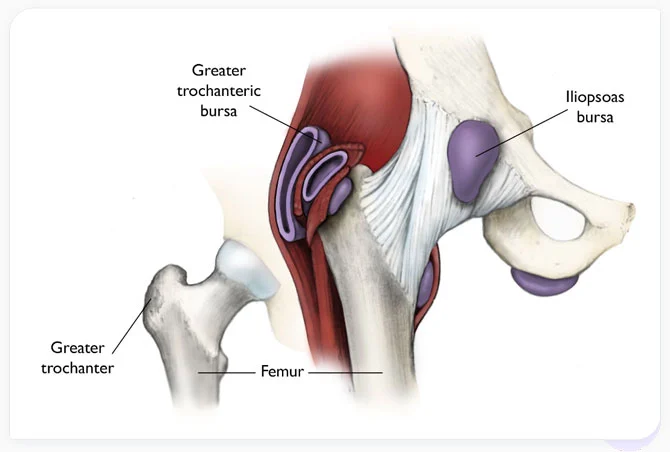 Figure 1. Bursae are small fluid-filled sacs that reduce friction between bone and surrounding soft tissue (e.g., tendons, ligaments, or muscle). Hip bursitis or greater trochanteric bursitis is the inflammation the bursae (shown in blue) in your hip at the top of the femur.