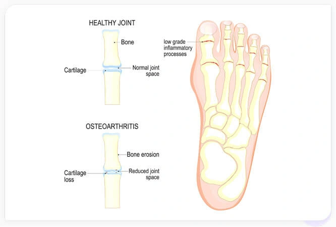 Figure 1: Depiction of foot osteoarthritis. Healthy joints have intact articular cartilage and space between opposing bones in a joint. Arthritic joints have damaged cartilage on each bone that increases the friction between due to decreased joint space.Other types of foot pain include: